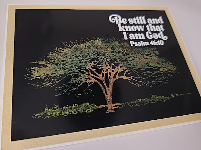 I used an old wood block tree stamp (from A Stamp In The Hand Co.) and brushed some Judikins' Mica Gloss on the stamp and stamp directly on glossy black cardstock. I white embossed "Be still and know I am God" (from Divinity Designs' Bold Blessings stamp & die duo) on black cardstock and used the matching die to cut it out. I attach it on the upper right corner of the background. I matted the glossy black background on a shimmer gold cardstock, then attached it on a white card base. Below is another look of the card: